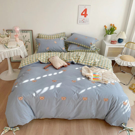 Water-washed Cotton Embroidered 4 in 1 Bedding Sets Bowknot Plaid Bear